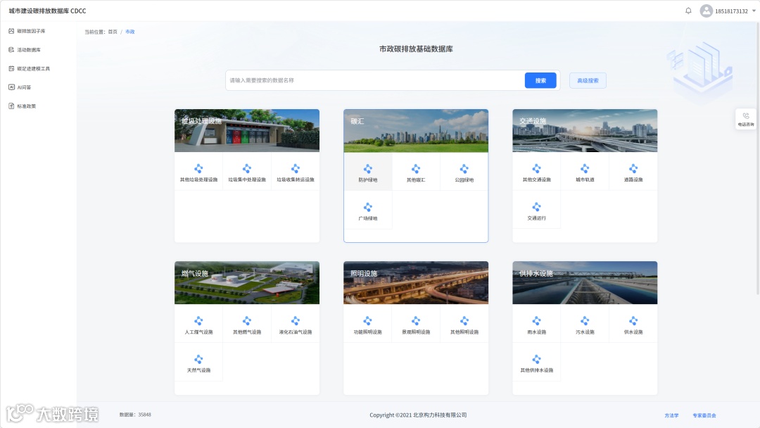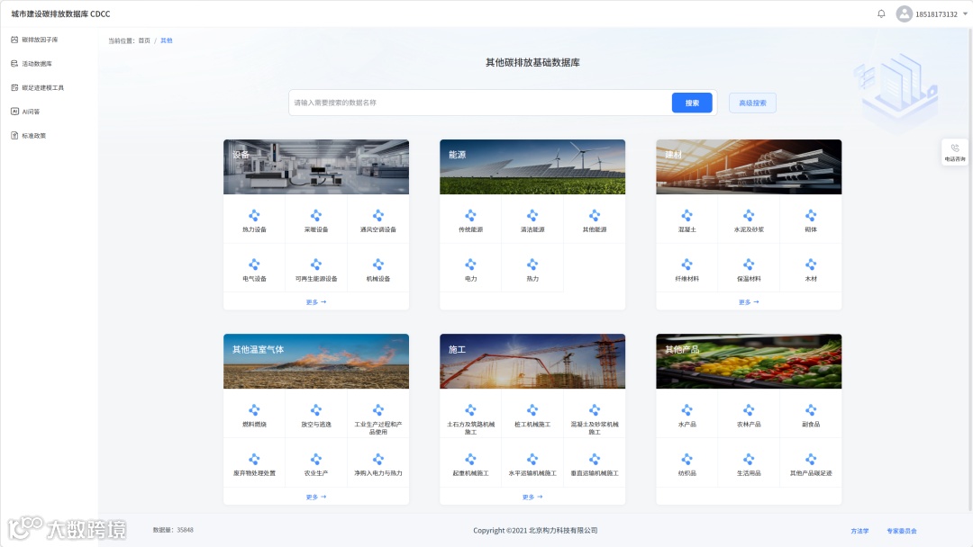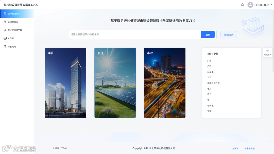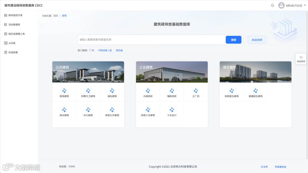 为让专业的碳排放因子数据更易获取、更易使用,因子库依托多层级碳排放核算因子调用规则,开发了智能 AI 系统,打造集因子库、活动数据库、碳足迹建模工具、标准政策查询、AI 问答于一体的城市建设碳排放数据库 CDCC,界面清晰分类建筑、市政、其他三大板块,支持精准搜索与高级检索,满足不同用户的查询需求。