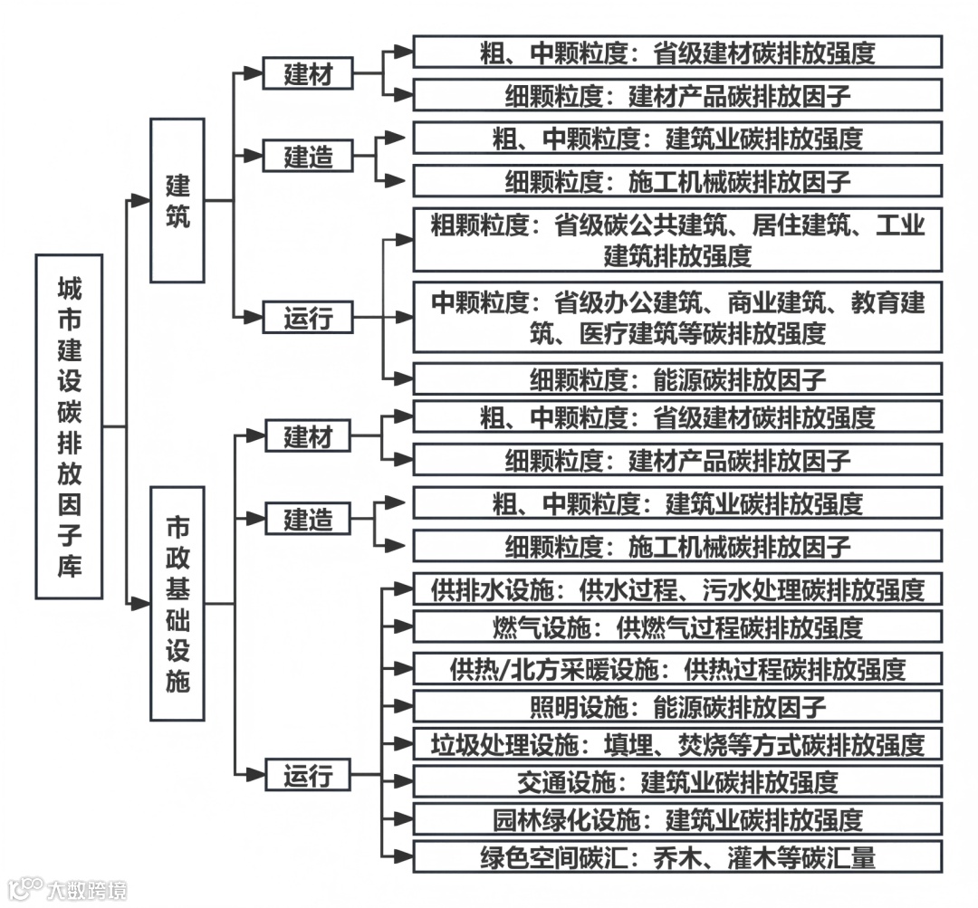 ·市政基础设施板块:覆盖供排水、燃气、供热、照明、垃圾处理、交通、园林绿化等全品类设施,既包含各设施建筑业碳排放强度、施工机械因子等建造数据,也涵盖供水、污水处理、垃圾填埋 / 焚烧等运行排放强度,同时纳入乔木、灌木等绿色空间碳汇量数据。