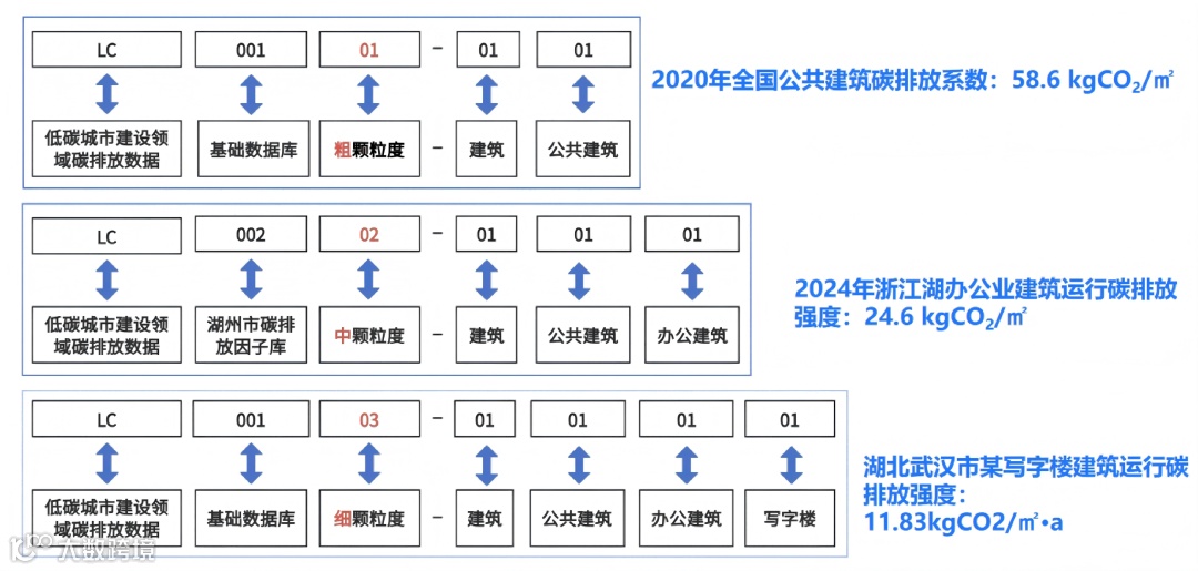·建筑板块:从省级整体建筑排放强度(粗),到办公、商业、教育等细分建筑类型省级排放强度(中),再到单体建筑及能源碳排放因子(细),层层拆解建筑全生命周期碳排放数据。