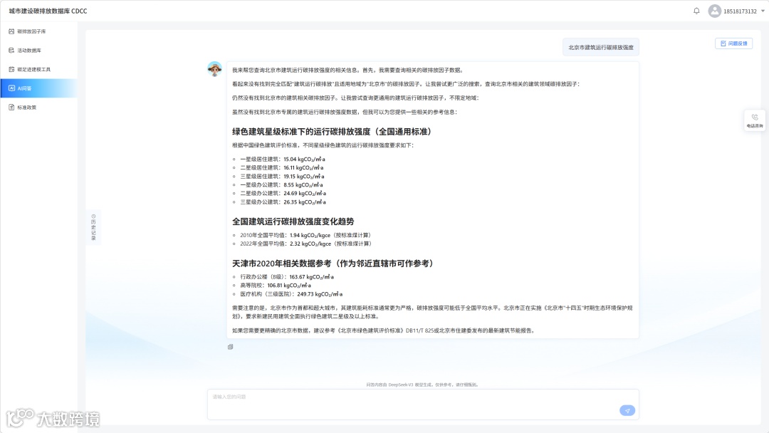例如查询“北京市建筑运行碳排放强度”,系统在未检索到专属数据后,将自动推送全国绿色建筑星级标准下的运行碳排放强度、全国建筑运行碳排放强度变化趋势,以及邻近直辖市天津的相关参考数据,并给出专业的数据分析与资料查询建议,让数据查询更具指导性。