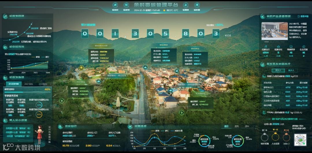 以浙江湖州安吉余村为示范样板,中国建研院着力建设“可看、易管、好用”的零碳余村综合运营管理平台,重点建设面向管理部门监督决策的零碳驾驶舱、面向运营团队运营推广的碳管理工作台及面向群众可互动体验的的碳普惠小程序。平台面向零碳乡村建设、运行管理过程中的不同参与角色,如镇政府管理部门、余村280户居民、来访游客等,提供不同应用场景下的碳核算、分析、激励、交易及价值兑现等服务,并通过配套管理和商业机制,广泛调动余村各界资源参与减排行为,推动形成绿色低碳生产生活方式,助力余村零碳乡村建设目标实现。