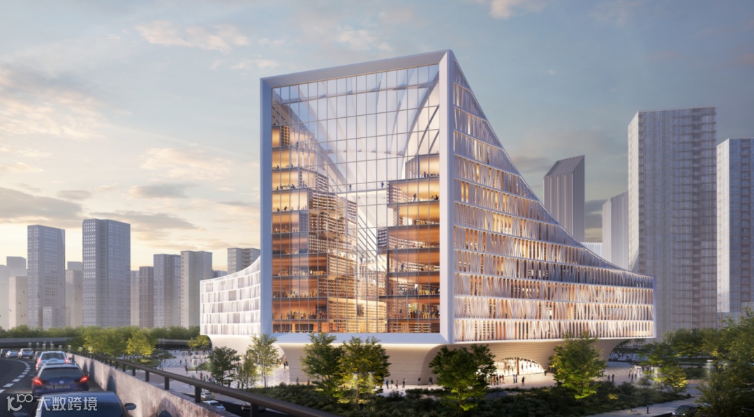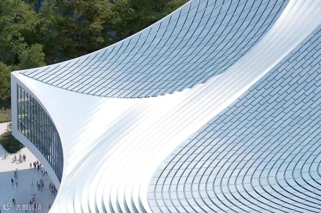 建筑屋面作为“第五立面”,以曲线造型由西南向东侧跌落,最高点73.5米,最低点39.5米。从空中俯瞰,整个建筑犹如一座未来感十足的“会呼吸的知识峡谷”。
