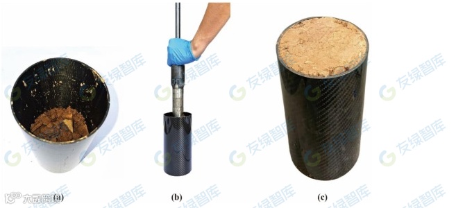 CFRP-RE 圆筒制造:(a) 装满松散土壤混合物的 CFRP 管,(b) 使用气动夯实,以及 (c) 干燥 28 天后的 CFRP-RE 圆筒。