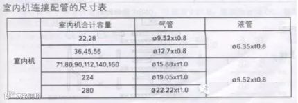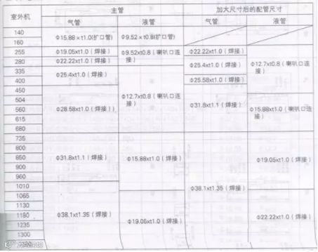 1)室外机容量在255~960时,最长从(室外机到最远的室内机)在90m以上时,一定将气侧、液侧的主管尺寸加大。
