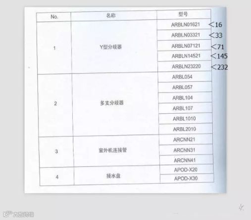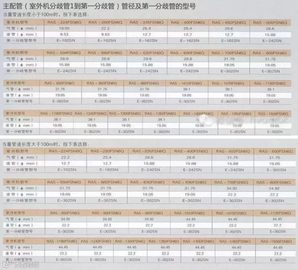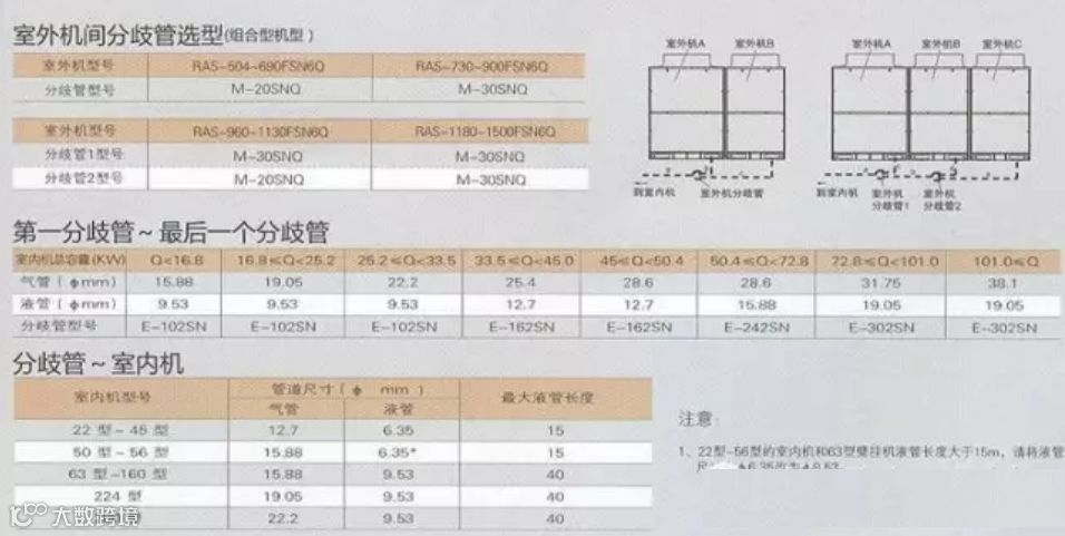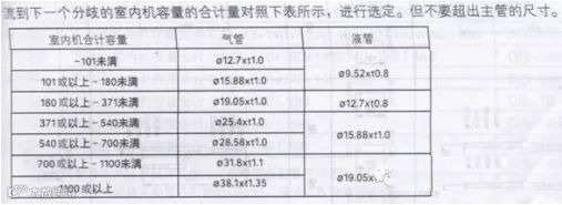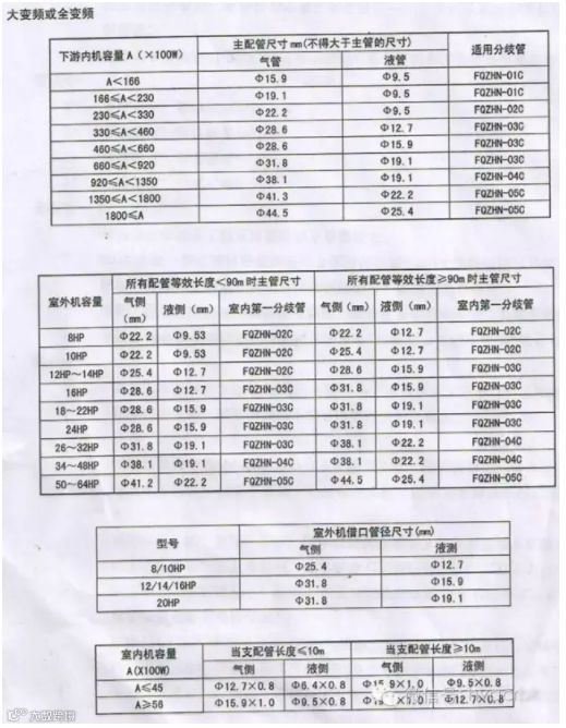 3、 室内机配管分歧管之间管径选择表