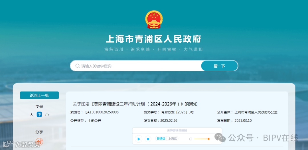 3月10日,上海市青浦区人民政府印发《美丽青浦建设三年行动计划 (2024-2026年)》的通知,通知指出,推进“光伏+”专项工程,本区光伏备案项目11.7万千瓦,光伏装机容量达到19.4万千瓦以上。推动氢能多元化利用,打造氢能及燃料电池产业园,积极推进零碳氢储源网荷储一体化项目示范。开展风能、生物质能的推广应用,推进一批资源循环利用项目建设。