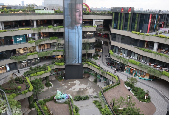 改造后的百联西郊购物中心在立面上,选用了更先进的新型玻璃和有灵动感的咖色铝板飘带,如同藤蔓生长一样,环绕在整个立面,在外立面上打造立体花园式景观。沿街,咖啡色铝板的应用不仅赋予了建筑沉稳而高雅的质感,更在光影交错间展现出独特的韵律美;而内部则大胆地保留了清水混凝土的原始色彩,质朴而纯粹,与外侧的精致形成鲜明对比,却又和谐共生。
