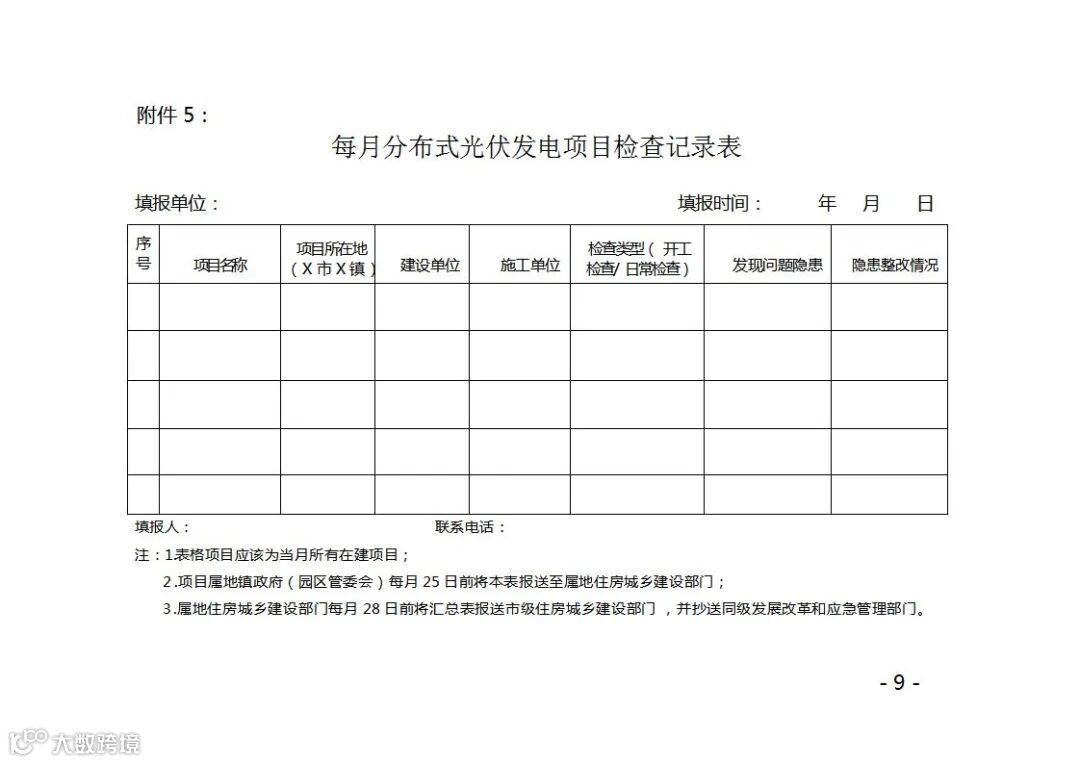 (一)健全完善监管机制。分布式光伏发电项目由镇政府(街道办、园区管委会)负责施工安全监管,区发展改革、住房城乡建设、应急管理、自然资源和城市管理综合执法等部门按职能指导项目镇政府(街道办、园区管委会)开展分布式光伏发电项目施工安全监管相关工作。镇政府(街道办、园区管委会)应加强日常施工安全检查,在项目开工前现场核查项目开工条件。每月25日前报送《每月分布式光伏发电项目检查记录表》(附件5)至区住房城乡建设局。区住房城乡建设局收集汇总各镇政府(街道办、园区管委会)报表数据,每月28日前报送市住房城乡建设局,并抄送区发展改革局和区应急管理局。