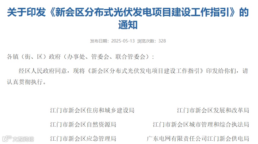 5月13日,广东省江门市新会区住房和城乡建设局发布关于印发《新会区分布式光伏发电项目建设工作指引》的通知。