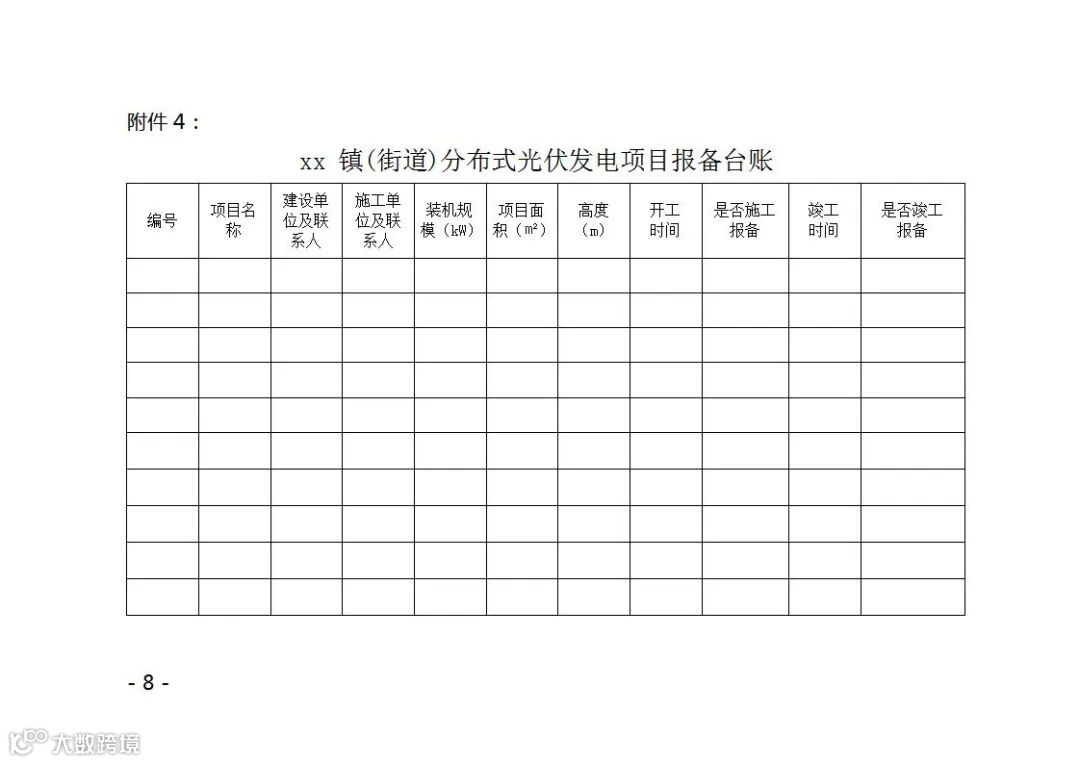 (三)验收。分布式光伏发电项目完工后,由项目建设单位组织设计、施工、监理、调试运行等相关单位,依法依规完成验收手续,向所属镇政府(街道办、园区管委会)提交《新会区分布式光伏发电项目(建筑部分)工程竣工报备表》(附件2)进行竣工报备。完成竣工报备后,可按程序向属地供电所申请办理并网验收。属地供电所按照《分布式光伏发电并网验收意见单》进行并网验收(附件3)。未办理竣工报备的,供电部门不予办理并网验收。镇政府(街道办、园区管委会)要形成《分布式光伏发电项目报备台账》(附件4),加强对分布式光伏发电项目施工报备、检查和竣工监管。
