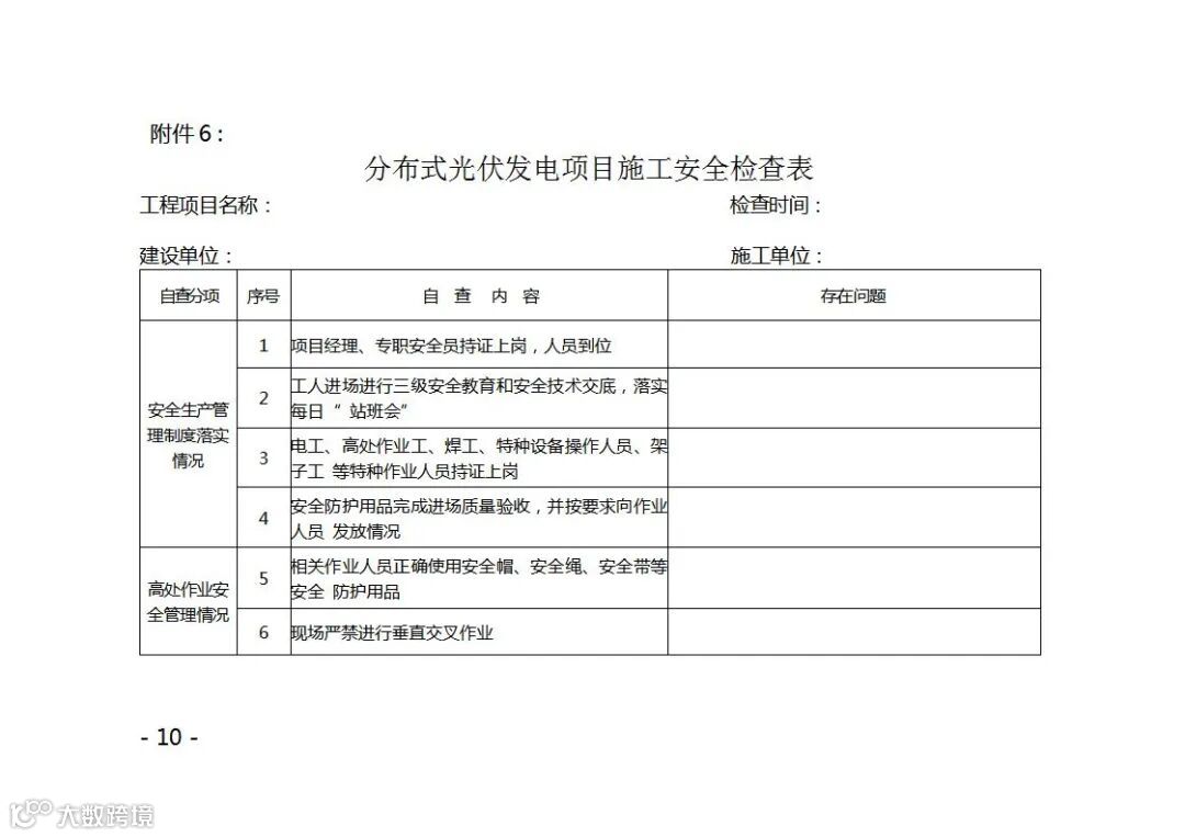 (三)压紧企业安全管理人员责任。施工单位项目负责人应联合建设单位项目负责人每周组织开展施工安全巡查,对照《分布式光伏发电项目施工安全检查表》(附件6)逐项排查现场施工安全隐患,记录并建立隐患排查整改台账,定时、定人、定措施整改现场施工安全隐患。项目安全管理人员应认真落实班前晨会制度,告知施工作业安全风险,提高施工人员安全意识,增强安全防范能力,规范施工作业流程。建立专职安全员每日巡查制度及时发现、报告、整改施工安全隐患,如实记录施工安全日志。
