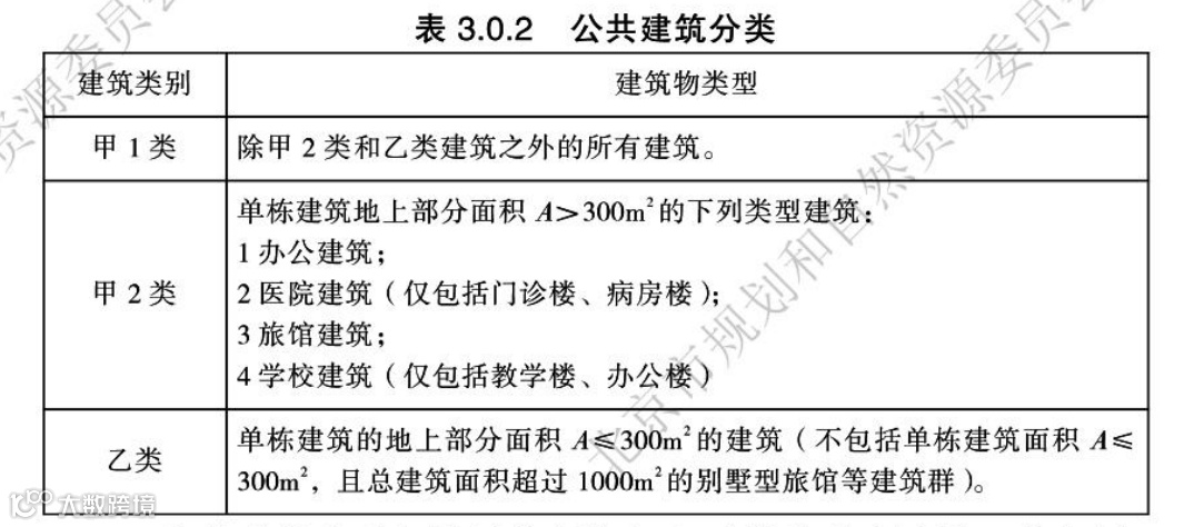 提出甲1类、甲2类、乙类公共建筑分类。地上部分面积,指室外地坪以上的建筑面积。但当地下室或半地下室四周外墙等外围护结构与室外空气接触部分的面积超过地下室外围护结构总面积的50%时,该层地下室面积计入地上面积。
