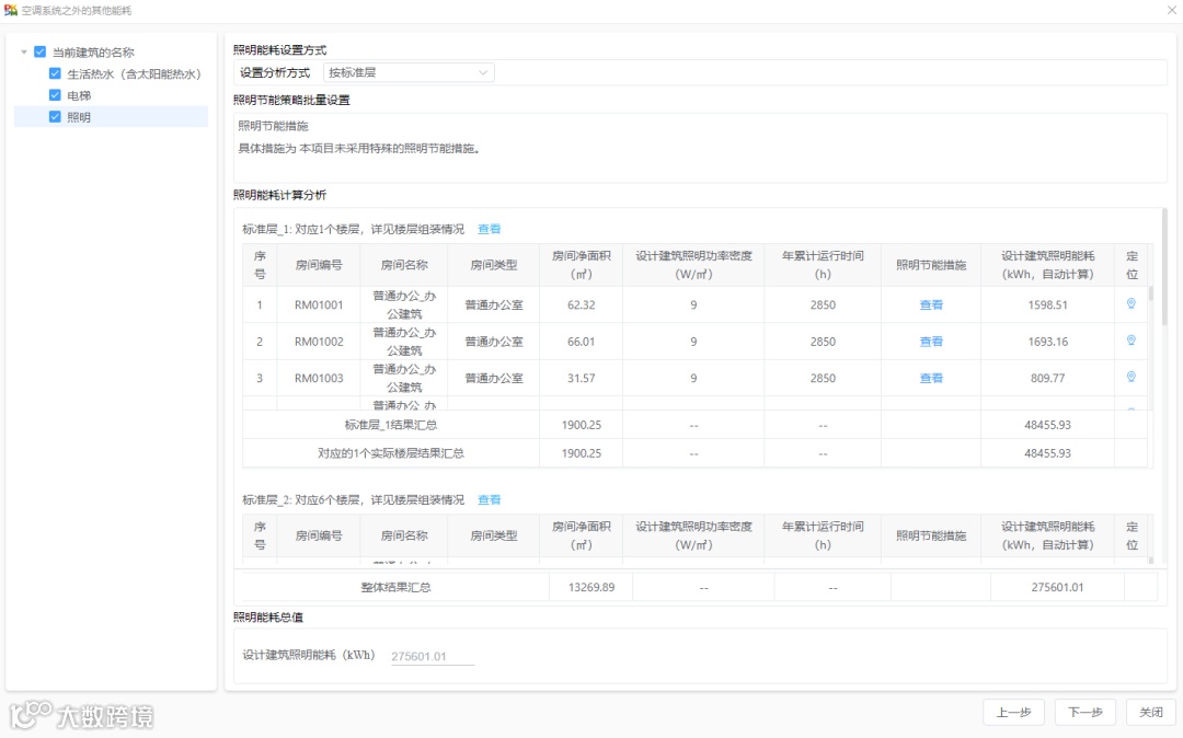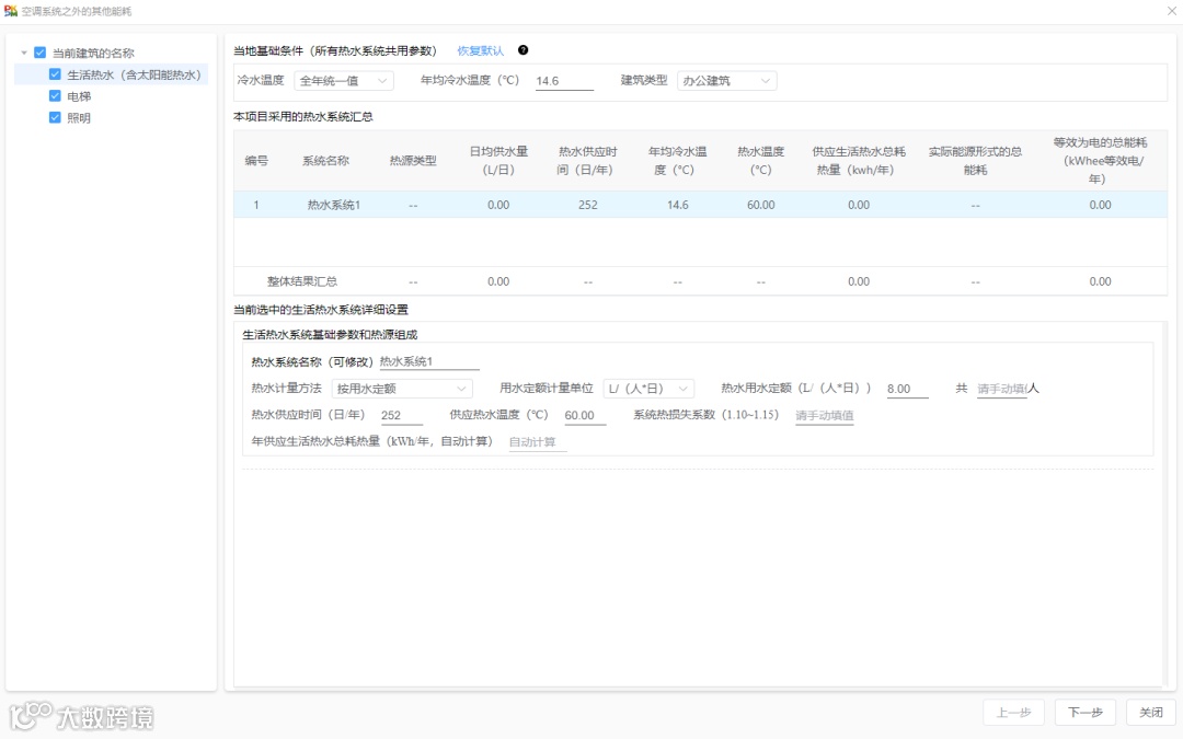 建筑设计能耗计算指标内容包含供暖、空调、照明、电梯以及生活热水。《标准》首次提出节能计算需要按照空调系统设计方案进行能耗计算。首先需进行空调及冷源系统方案选型,再根据逐时负荷率下的设备性能系数进行能耗计算。当厂家未提供不同负荷率下的产品性能系数时,可根据软件内置的设备性能曲线进行拟合计算。