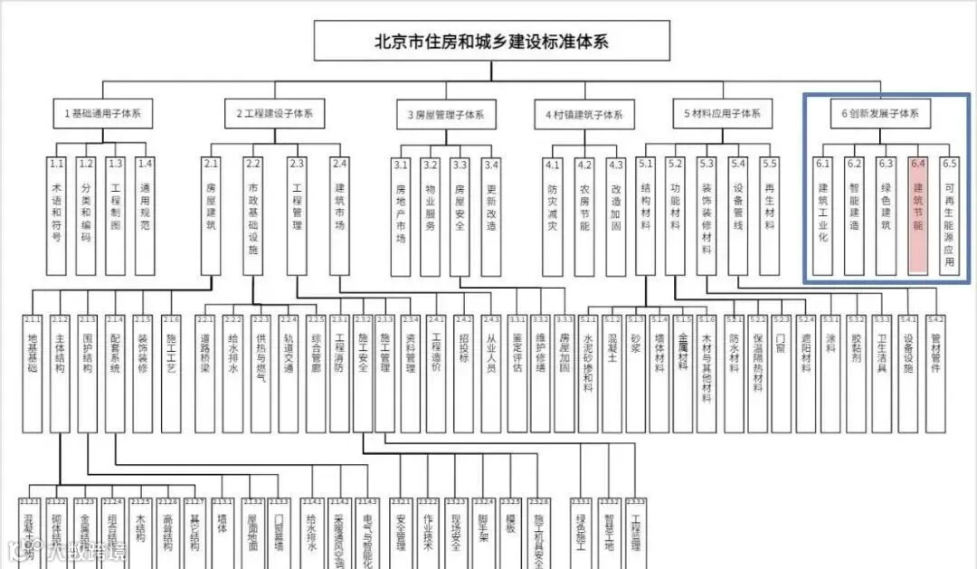2024年11月29日,北京市住房和城乡建设委员会、北京市市场监督管理局印发《北京市住房和城乡建设标准体系(2024版)》,北京市住房和城乡建设标准体系包括基础通用、工程建设、 房屋管理、村镇建筑、材料应用、创新发展6个子体系,下分25个分子体系、36个专业、22个子专业。“建筑节能”属于“创新发展子体系”(如下图):