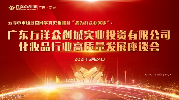 为推动新兴万洋众创城园区化妆品产业高质量发展,简化园区化妆品企业审批办理手续,加快企业落地投产。2021年5月24日下午,在广东(新兴)万洋众创城开展云浮市市场监督局学党史优服务“我为群众办实事”:广东万洋众创城实业投资有限公司化妆品行业高质量发展座谈会。云浮市市场监督管理局局长欧皓率领各级市场监督职能部门以及新兴县市场监督管理局出席会议,万洋众创城云浮城市公司总经理游源、新兴万洋众创城智慧园区运营负责人陆欢以及邀请新兴万洋众创城园区多位化妆品企业代表出席会议。会议将围绕如何更好地服务好园区投产企业,帮助企业高质量发展。