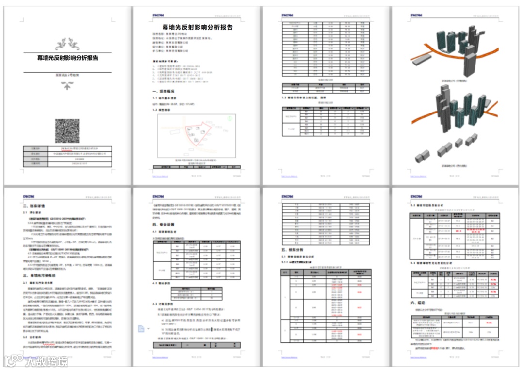 软件生成的幕墙光反射影响分析报告分为项目概况、参数设置、模拟分析等几大块内容,详情见下表。