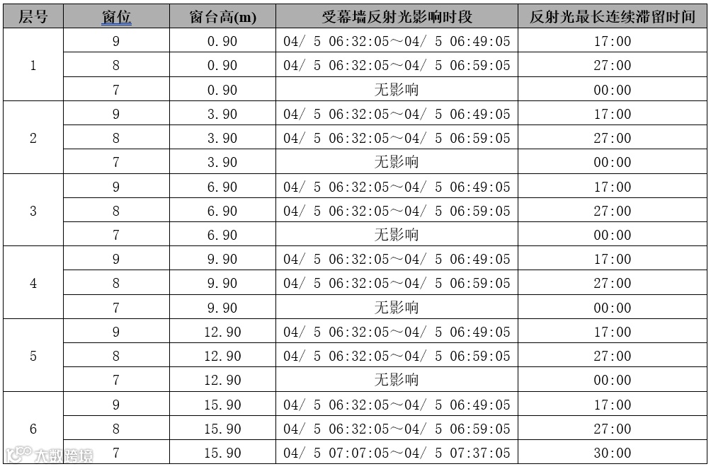 窗受幕墙反射分析表