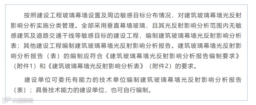1、在居住建筑、医院、中小学校、幼儿园周边区域以及主干道路口、交通流量大的区域设置玻璃幕墙时, 应进行玻璃幕墙反射光影响分析;