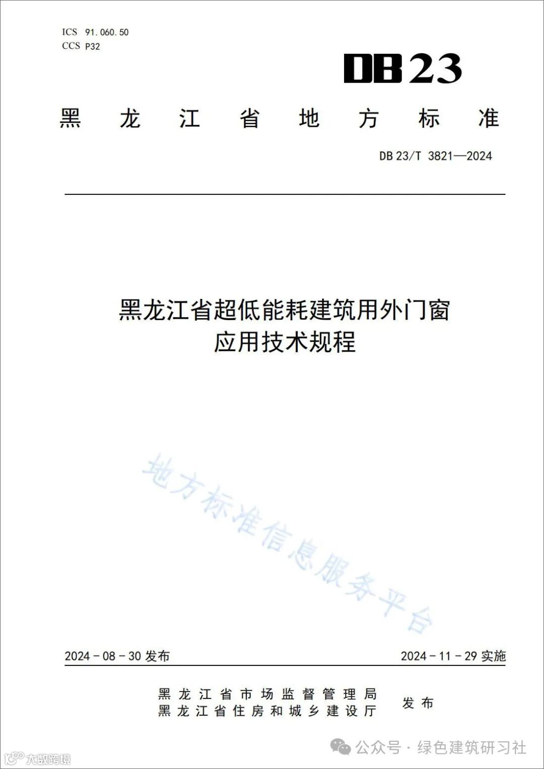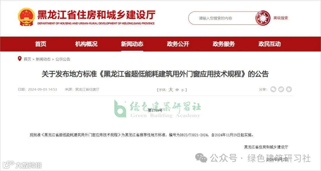 9月2日,黑龙江省住房和城乡建设厅批准《黑龙江省超低能耗建筑用外门窗应用技术规程》为黑龙江省推荐性地方标准,编号为DB23/T3821-2024,自2024年11月29日起实施。