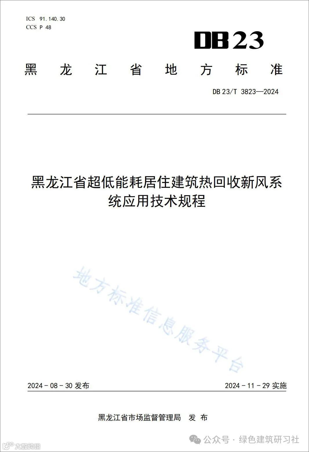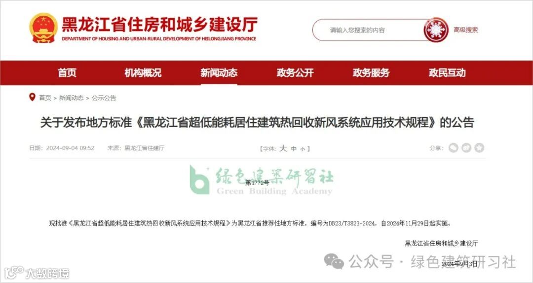 9月3日,黑龙江省住房和城乡建设厅批准《黑龙江省超低能耗居住建筑热回收新风系统应用技术规程》为黑龙江省推荐性地方标准,编号为DB23/T3823-2024,自2024年11月29日起实施。