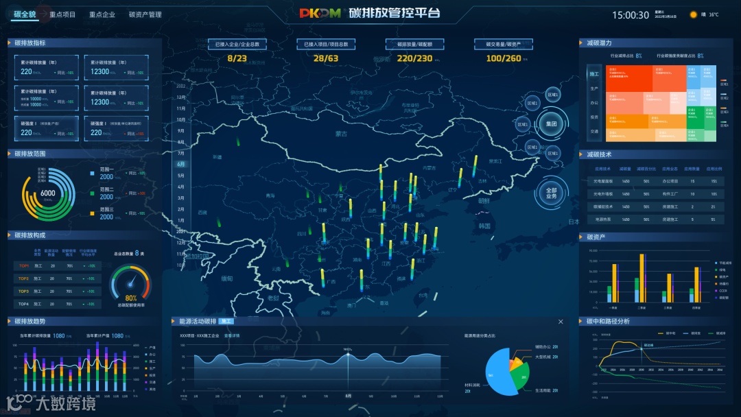PKPM-CC双碳云服务平台(数据看板)用于碳排放统计分析数据的可视化呈现与减碳成果展示,配套双碳云(企业版),碳排放数据实时联动,落地碳排放应用,结合BIM、GIS等技术手段,扩展展示内容,丰富展现形式,为建筑行业碳排放工作锦上添花。