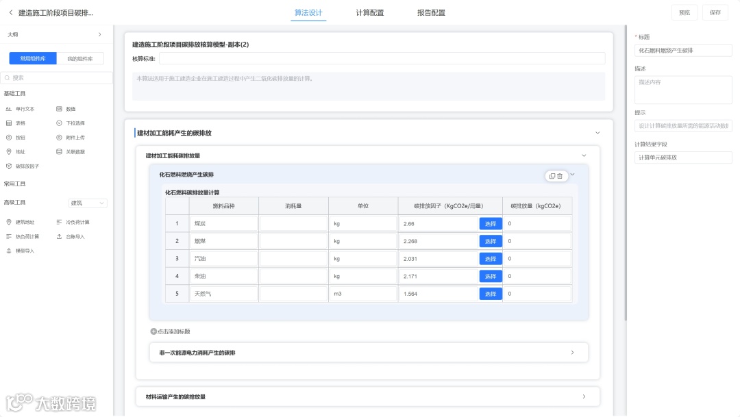 PKPM-CC双碳云服务平台提供计算方法的无代码自定义功能,用户根据碳排放管理需要,通过拖拽添加碳排放专用组件、配置计算规则,无需代码基础,即可快速构建满足用户需求的碳排放算法模型(计算方法),亦可基于既有算法模型(计算方法)调整,帮助用户充分发掘的碳排放应用场景,快速建立合适的碳排放计算方法。