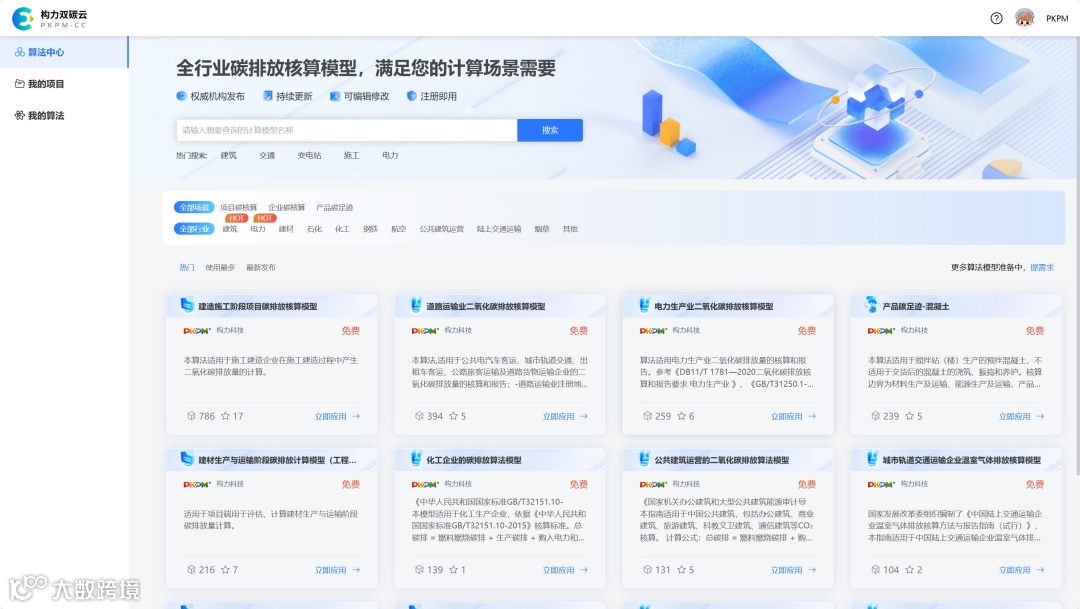 PKPM-CC双碳云服务平台内置丰富的碳排放算法模型(计算方法),涵盖建筑、电力、交通等多个建筑相关领域,通过平台可对算法模型(计算方法)进行全局查看、精准搜索,计算内容与计算方式在线浏览,帮助用户快速找到匹配的碳排放计算方法。