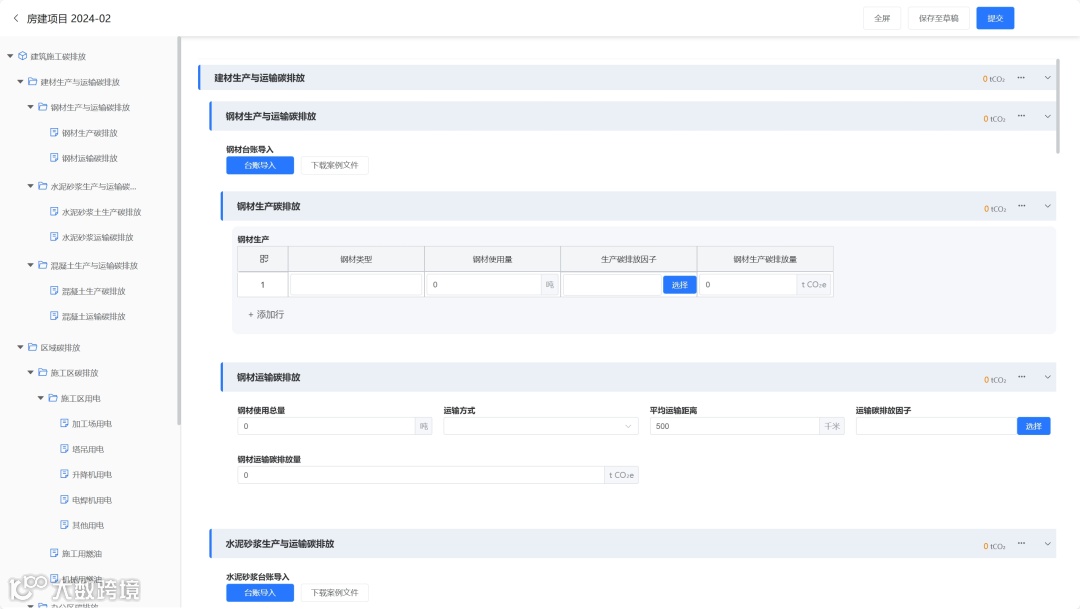 PKPM-CC双碳云服务平台可用于企业与项目碳排放数据的采集,用户根据需求创建企业/项目,在平台中选择合适的碳排放计算方法,也可使用专用组件自行建立碳排放计算方法,完成企业/项目创建后,可邀请相关人员加入组织,根据算法要求进行数据的采集录入,完成企业/项目碳排放数据的采集记录。