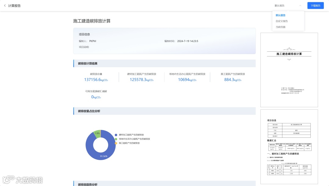 PKPM-CC双碳云服务平台提供碳排放计算报告输出功能,用户在完成碳排放的计算后,可在线生成碳排放分析报告,分析报告包含碳排放基础数据、计算说明、计算结果、数据报表等内容,报告支持导出操作,支持二次修改,用户可使用该报告进行碳排放数据的上报与存档。