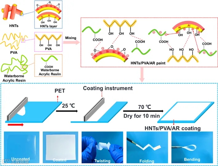 图1 PET片材上HNTs/PVA/AR复合涂层的制备示意图及界面相互作用。