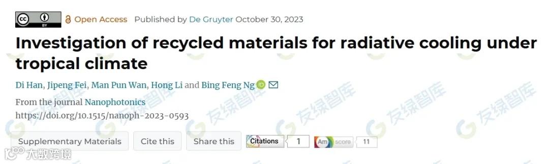 该研究以题为“Investigation of recycled materials for radiative cooling under tropical climate”的论文发表在2024年3月的第5期《纳米光子学》。