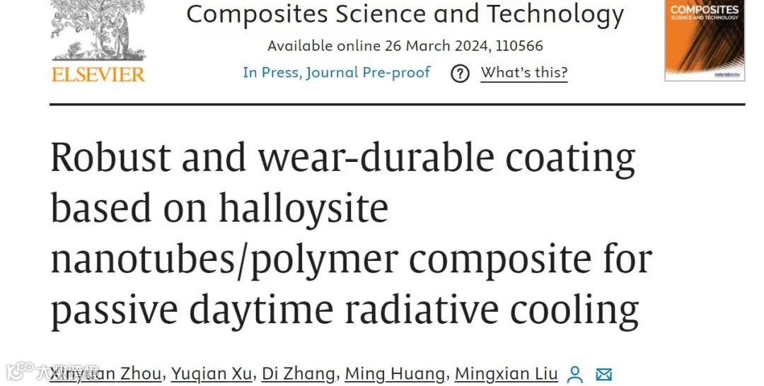 2024年3月26日,该研究成果以 " Robust and wear-durable coating based on halloysite nanotubes/polymer composite for passive daytime radiative cooling " 为题发表在Composites Science and Technology(影响因子9.1,一区TOP)期刊上。2022级硕士生周心愿为该论文第一作者,刘明贤教授为唯一通讯作者。