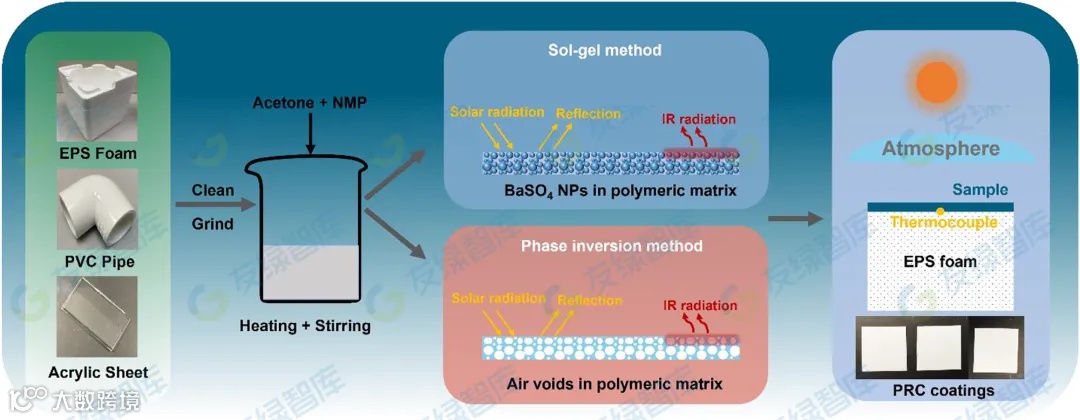 回收的聚合物产品:发泡聚苯乙烯(EPS)泡沫,聚氯乙烯(PVC)管和丙烯酸板被清洗并使用研磨机研磨成小块。随后,将小块回收聚合物加入到N-甲基-2-吡咯烷酮(NMP)和丙酮的混合物中,如图1所示。然后将混合的混合物在加热板上加热至80°C并搅拌,直到聚合物完全溶解到溶液中。BaSO4将粉末(Sigma-Aldrich)分散到聚合物溶剂体系中,并在80°C下再搅拌30分钟,以确保BaSO的均匀混合4聚合物基质中的颗粒。随后使用刀片涂布机将涂布前体涂覆在抛光铝板上,以进行溶剂蒸发。本研究中所有再生塑料的制备和BaSO的质量比均采用相同的步骤和溶剂4聚合物的比例为15:1,可实现高反射和稳定的表面,没有任何裂纹。