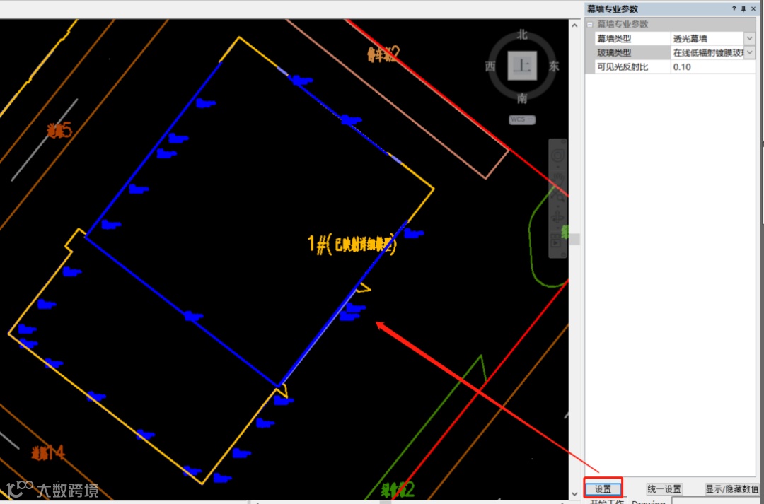 点击【幕墙光分析】-【专业设计】-【幕墙专业设计】,选择幕墙设置幕墙的玻璃类型和可见光反射比。