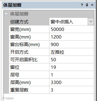 ①顺序插入:设置窗的几何尺寸,位置以及窗的重复层数 ,选中要插窗的体量边,输入体量窗的间距,空格即可绘制体量窗。