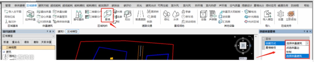 点击【区域建模】-【区域构件】-【幕墙】,即可绘制幕墙,其中幕墙的建模方式有三种:
