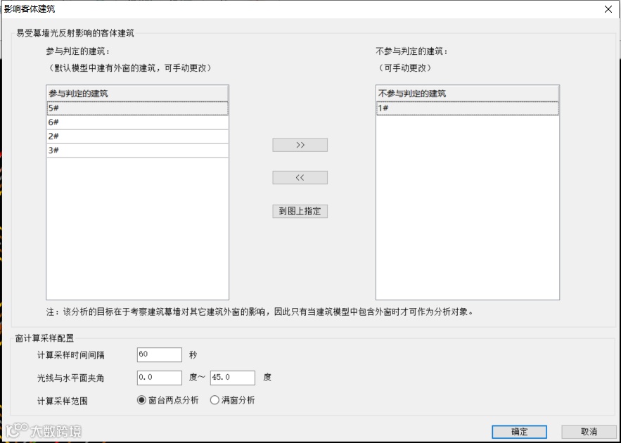 3)选择受幕墙光反射影响的客体建筑,同时设置窗计算采样时间间隔,计算采样范围,通常有两种,窗台两点分析和满窗分析,软件默认参数按照《光环境评价方法》GB/T 12454-2017 B.3条设定。其中计算采样范围根据《建筑日照计算参数标准》GB/T 50947-2014设定。