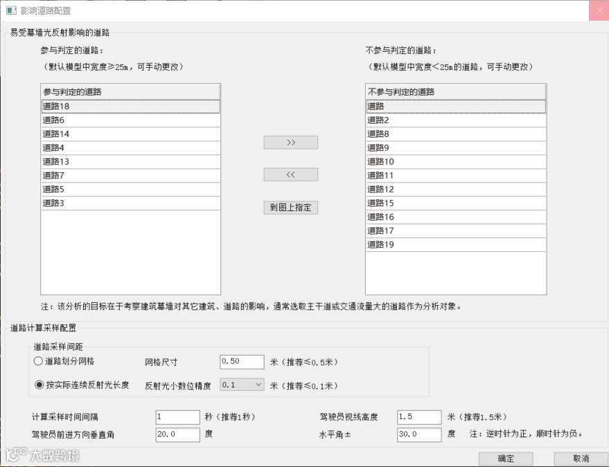 4)选择受幕墙光反射影响的道路,同时设置道路的采样间距和计算采样时间间隔,主要参数按照《光环境评价方法》GB/T 12454-2017 B.4条设定,其中规范未明确的参数软件按照经验取值。