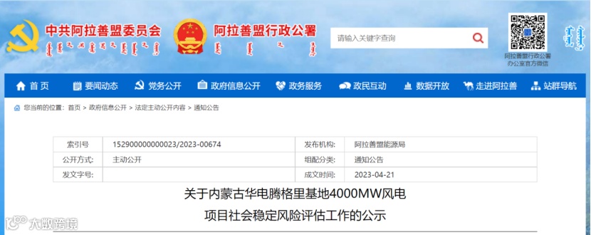 关于内蒙古华电腾格里基地4000MW风电项目社会稳定风险评估工作的公示