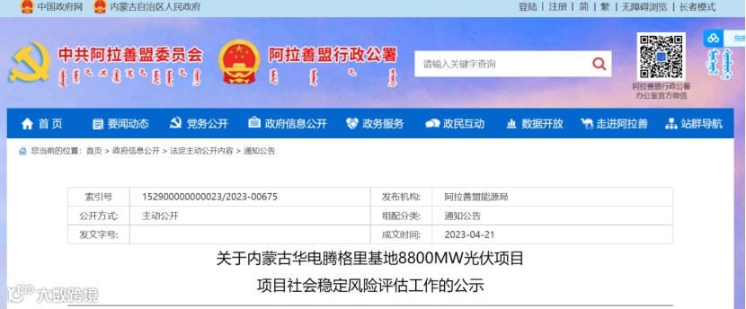 4月21日,阿拉善盟能源局发布内蒙古华电腾格里基地8800MW光伏和内蒙古华电腾格里基地4000MW风电社会稳定风险评估工作公示。