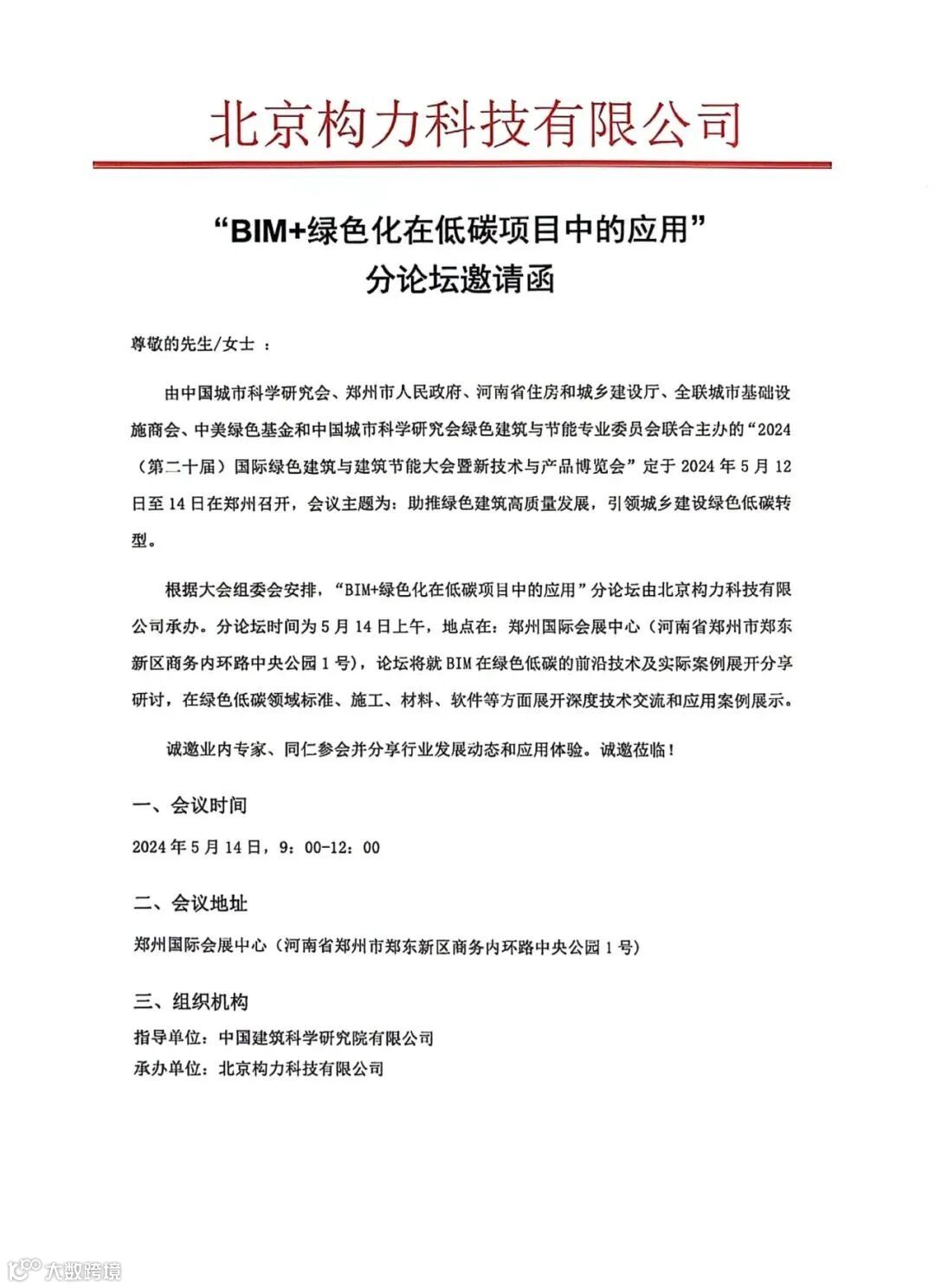 根据大会组委会安排,“BIM+绿色化在低碳项目中的应用”分论坛由北京构力科技有限公司承办。分论坛时间为5月14日上午,地点在:郑州国际会展中心(河南省郑州市郑东新区商务内环路中央公园1号),论坛将就BIM在绿色低碳的前沿技术及实际案例展开分享研讨,在绿色低碳领域标准、施工、材料、软件等方面展开深度技术交流和应用案例展示。