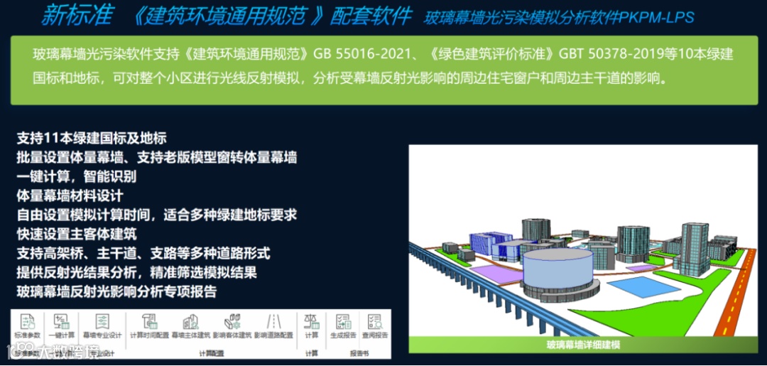玻璃幕墙光污染软件支持《建筑环境通用规范》GB 55016-2021、《绿色建筑评价标准》GBT 50378-2019等10本绿建国标和地标,可对整个小区进行光线反射模拟,分析受幕墙反射光影响的周边住宅窗户和周边主干道的影响。