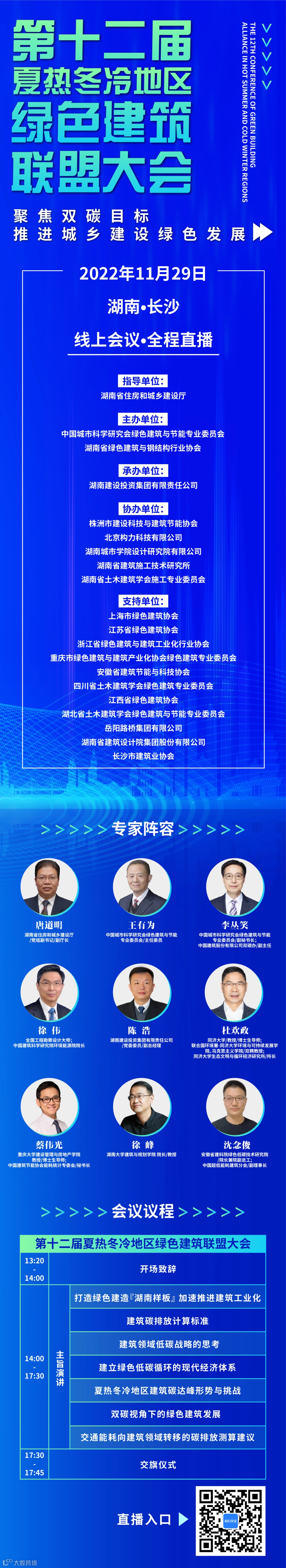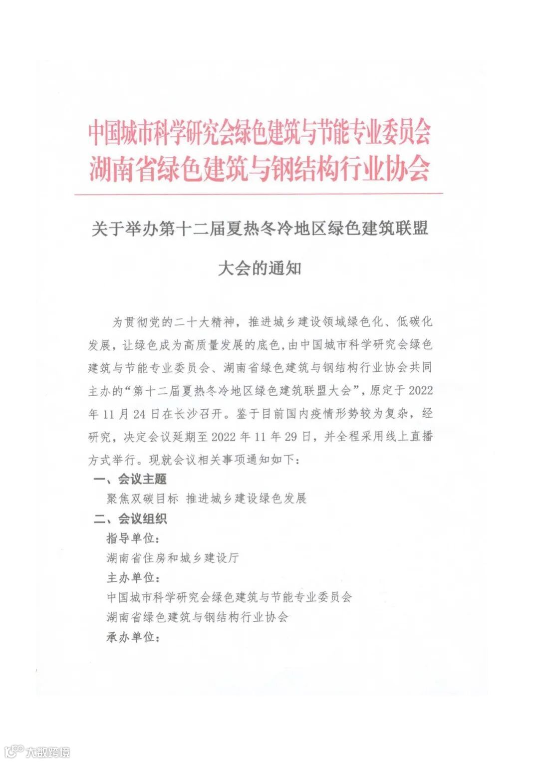 为贯彻党的二十大精神,推进城乡建设领域绿色化、低碳化发展,让绿色成为高质量发展的底色,由中国城市科学研究会绿色建筑与节能专业委员会、湖南省绿色建筑与钢结构行业协会共同主办的“第十二届夏热冬冷地区绿色建筑联盟大会”,原定于2022年11月24日在长沙召开。