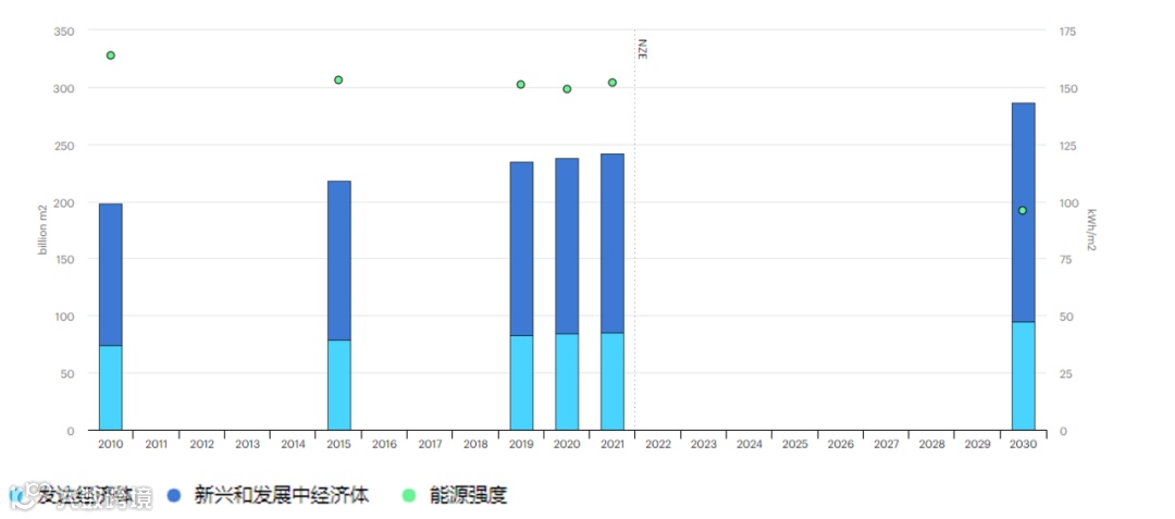 净零度情景下全球建筑面积和建筑物能源强度的演变(2010-2030年)
