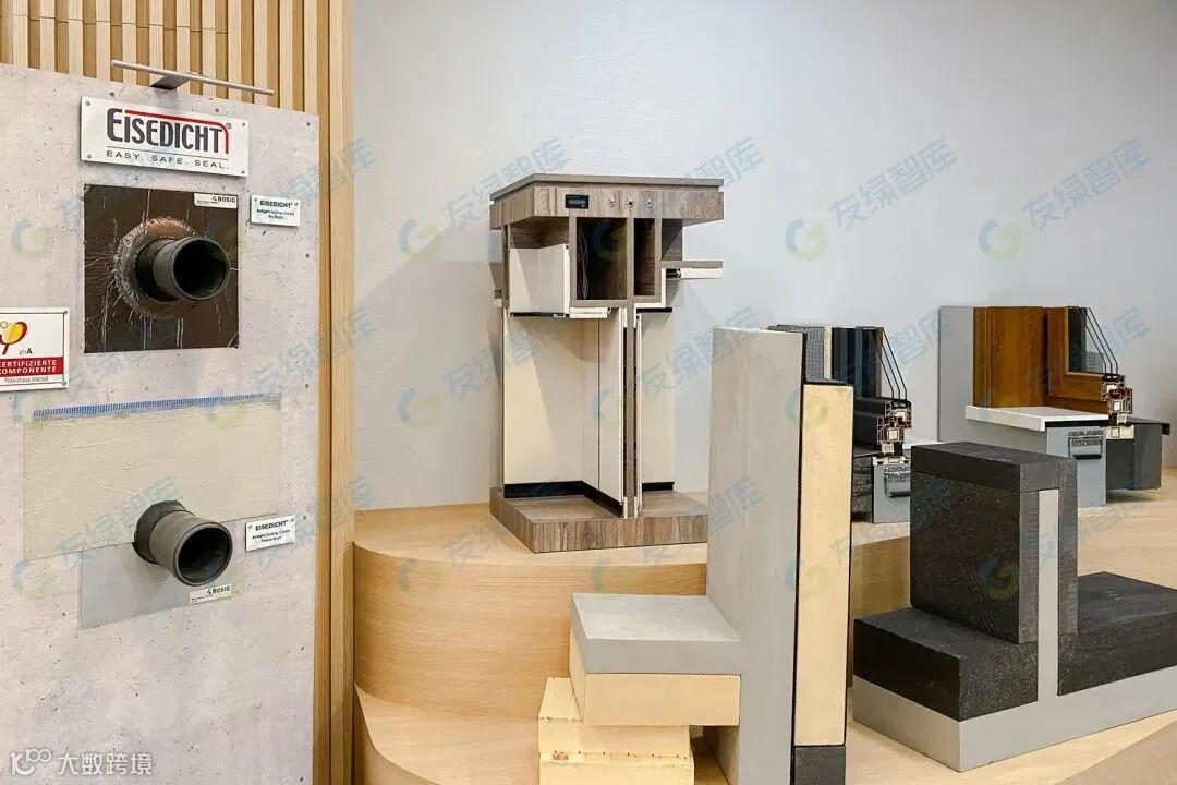 ▲保温材料、门窗、遮阳、新风、空气能和太阳能采暖等关键部品也都一一陈列。