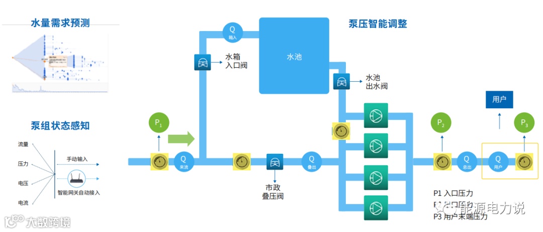 水务大脑,基于历史数据建立区域用水量预测AI模型,根据用水量需求预测、泵机流量、进出口压力、电机电压和电流等参数计算泵机效率,分析泵组实际运行工况,给出开/停机、频率等控制参数推荐值。在保证安全、稳定供水的前提下,进行智能化调压控制,实现能耗优化。经测算可以使制水供水单位能耗下降8%,减少供水环节用电造成的间接碳排放。