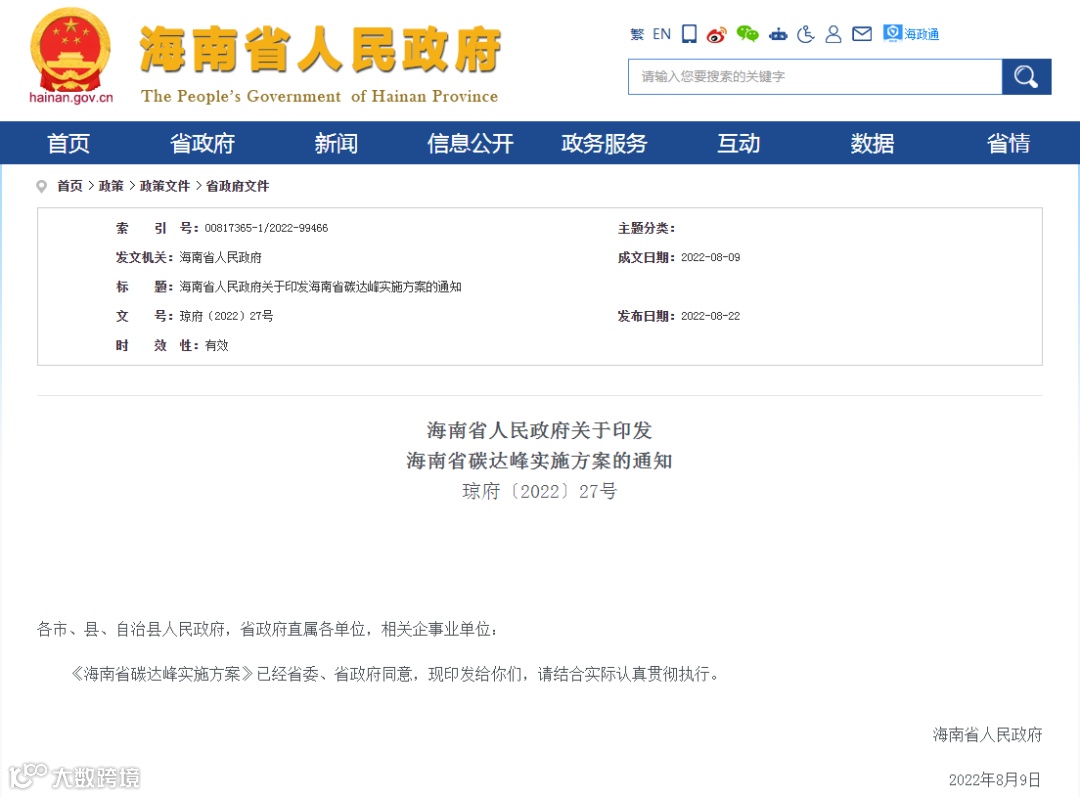 2022年8月22日,海南省人民政府印发《海南省碳达峰实施方案》的通知。(以下简称《实施方案》)。小盟对《实施方案》重点内容进行汇总及摘录如下: