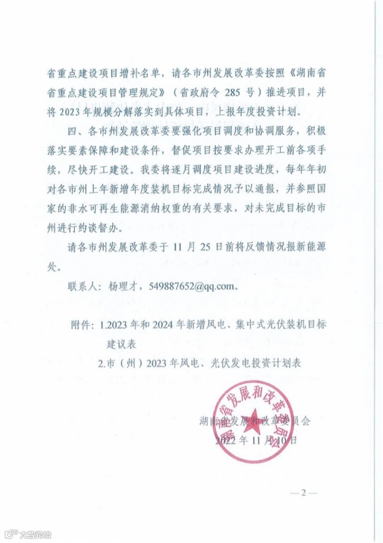 此外,湖南省“十四五”风电、光伏发电项目已经打捆纳入2022年省重点建设项目增补名单,湖南省发改委要求各市州发展改革委按照《湖南省省重点建设项目管理规定》(省政府令 285号)推进项目,并将2023年规模分解落实到具体项目,上报年度投资计划。各市州发展改革委于11月25日前将反馈情况报省发改委新能源处。