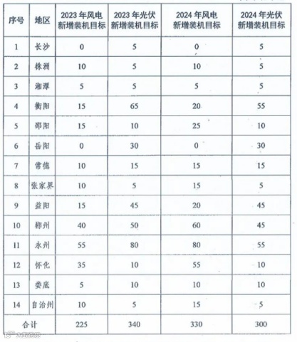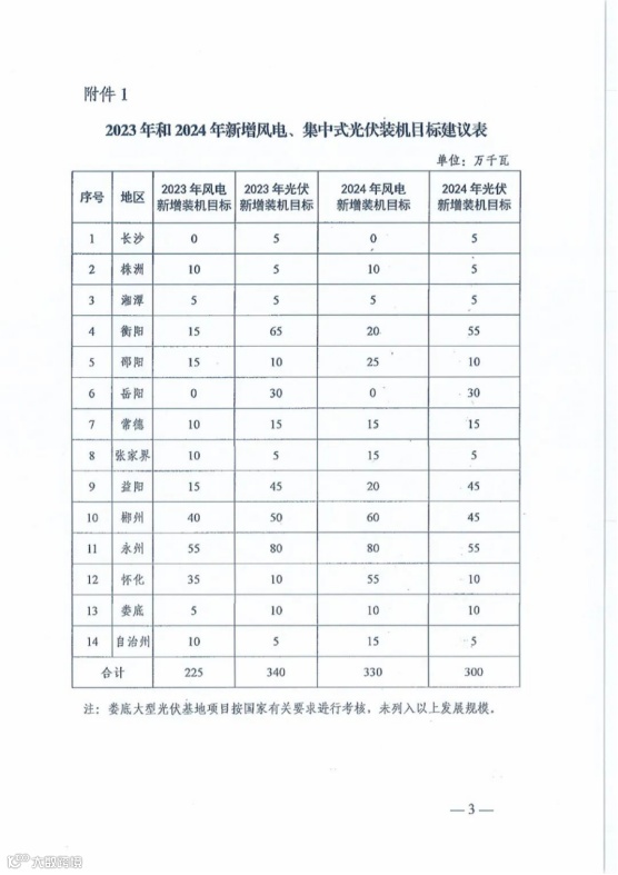 文件显示,根据国家对湖南省2023年、2024年的非水可再生能源消纳权重最低预期值,湖南委测算了2023年和2024年新增风电、集中式光伏最低装机目标,并结合资源分布和电网消纳能力分解到各市州。