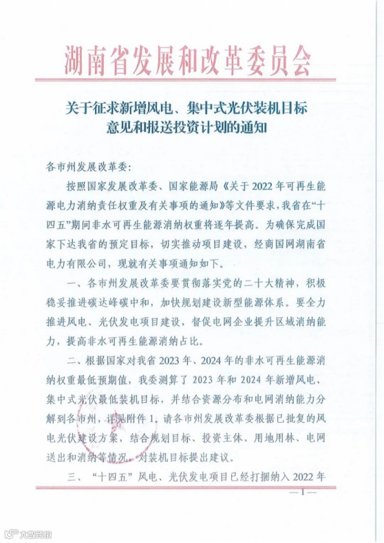 11月10日,湖南省发改委下发《关于征求新增风电、集中式光伏装机目标意见和报送投资计划的通知》。